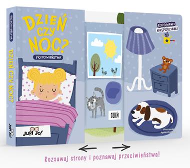 Każda strona książki "Dzień czy noc?" jest podzielona na pół i po rozsunięciu odkrywa przed małym czytelnikiem ukrytą ilustrację. Rozsuwając strony książeczki i obserwując jej bohaterów, najmłodsi będą poznawać nowe słowa i rozwijać mowę.